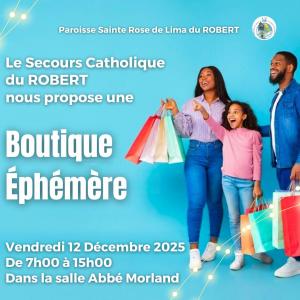 Le secours catholique du Robert vous propose une boutique éphémère le vendredi 12 décembre 2025 de 7h00 à 15h00 à la salle Abbé Morland (derrière l'église Sainte Rose de Lima du Robert).
