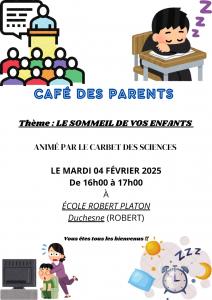 L'école Robert PLATON de Duchesne vous convie au "CAFÉ DES PARENTS" une conférence sur le thème du sommeil de vos enfants, animé par "LE CARBET DES SCIENCES" le Mardi 04 février 2025 de 16h00 à 17h00.