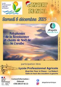 Le Lycée Professionnel Agricole du Robert vous invite à son concert "Polyphonie de la renaissance et chants de Noël de la Caraïbe" avec l'ensemble vocal Akapela samedi 6 décembre 2025 à 18h.