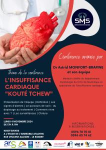 L'association Service Médiation Sociale vous invite à sa conférence sur l'insuffisance cardiaque "Kouté tchèw" lundi 4 novembre 2024 de 17h à 19h animée par Dr Astrid MONFORT-BRAFINE et son équipe à la Résidence Senior Atlantis, bâtiment Hallel'etage, 57 rue Vincent Allègre au Robert.