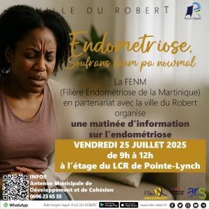 La FENM (Filière Endométriose de la Martinique) en partenariat avec la ville du Robert organise une matinée d’information sur l’endométriose vendredi 25 juillet 2025 de 9h à 12h à l’étage du LCR de Pointe-Lynch.