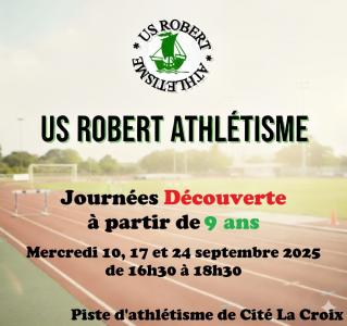 L'US Robert athlétisme vous convie à une journée découverte à partir de 9 ans, le Mercredi 24 septembre 2025 de 16h30 à 18h30, à la piste d'athlétisme de Cité La Croix.