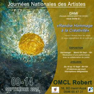 La présidente de l'Office Municipal de la Culture et des Loisirs du Robert Mme Gina Jean-François vous convie aux journées nationales des artistes du 09 au 12 septembre 2025.