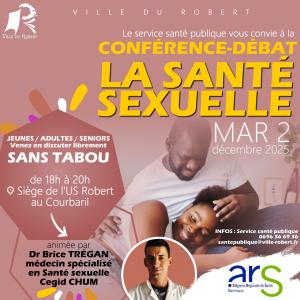 Le service santé publique de la ville du Robert vous convie à la conférence-débat "La santé sexuelle" animée par Dr Brice TRÉGAN médecin spécialisé en Santé sexuelle Cegid CHUM mardi 2 décembre 2025 de 18h à 20h au siège de l'US Robert au Courbaril. Jeunes, adultes, séniors, venez en discuter librement SANS TABOU !