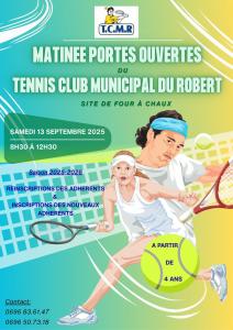 Le Tennis Club Municipal du Robert vous convie à une matinée portes ouvertes à partir de 4 ans le Samedi 13 septembre 2025 de 8h30 à 12h30 au site de Four à Chaux du Robert.