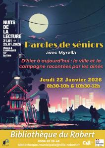 Dans le cadre de la nuit de la lecture, la bibliothèque municipale du Robert vous invite jeudi 22 janvier 2026 de 8h30 à 10h et de 10h30 à 12h à sa "Paroles de séniors" avec Myrella sur le thème "D'Hier à aujourd'hui : la ville et la campagne racontées par les ainés".