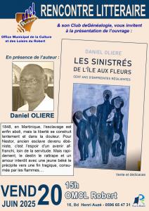 La présidente de l'Office Municipal de la Culture et des Loisirs du Robert Madame Gina Jean-François vous invite avec la contribution du club de généalogie à la rencontre littéraire autour de l'ouvrage "LES SINISTRÉS DE L'ÎLE AUX FLEURS" en présence de son auteur Daniel OLIERE le vendredi 20 juin 2025 à 15h à l'OMCLR.